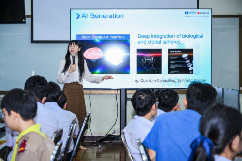 编程猫创始人兼CEO李天驰发表演讲 作为本次泰国站的核心内容,AI教育交流试点学校授牌仪式备受瞩目。由联合国教科文组织代表、泰国教科文全委会官员、编程猫创始人兼 CEO 李天驰与学校校长共同为两所泰国学校授予“联合国教科文组织亚非青少年人工智能教育交流与试点学校”称号,这两所学校从综合评估脱颖而出,成为泰国的首批试点学校,此前已有百余名学生完成编程猫AI与编程课程培训,部分优秀学生还受邀参与了今年7月在中国深圳举办的“亚非青少年AI中国行”活动。