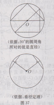 2.解:∠1=∠4,,2=∠7,,3=∠6,∠5=∠8.同弧所对的圆周角相等. 3.证明:∵∠AOB=2∠BOC,∴ ⌒AB =2⌒BC ,∴∠ACB=2∠BAC. 4.解:答案不唯一,如图37所示,仅给出两种方法. ![]()